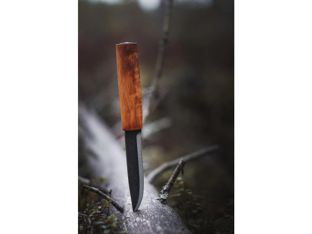 A laminált szénacél penge kemény maggal és rugalmasabb külső rétegekkel készül, így kiváló élmegtartást és tartósságot biztosít. A Scandi él különösen alkalmas fa megmunkálására és precíz vágási feladatokra.