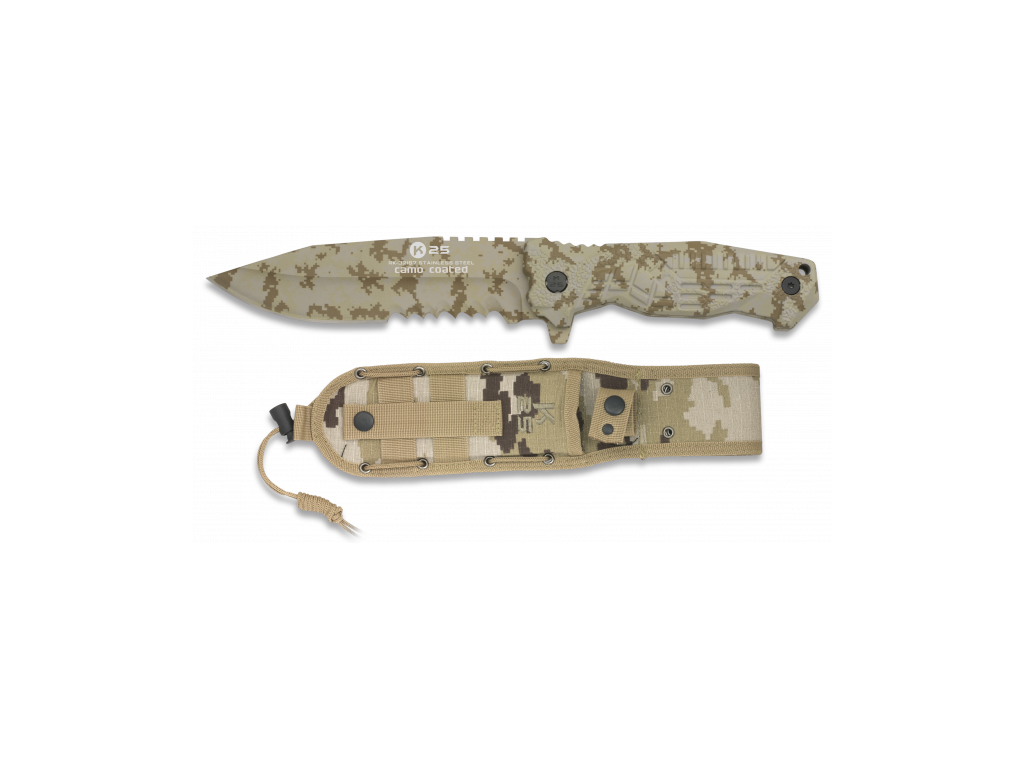 A K25 Tactical 32167 egy megbízható taktikai outdoor kés, amelyet túrázáshoz, kempingezéshez és survival helyzetekhez terveztek. Az egy darabból kialakított, titán bevonatos 8Cr13MoV rozsdamentes acél penge nagy szilárdságot és jó korrózióállóságot biztosít, így a kés nehéz körülmények között is magabiztosan használható.