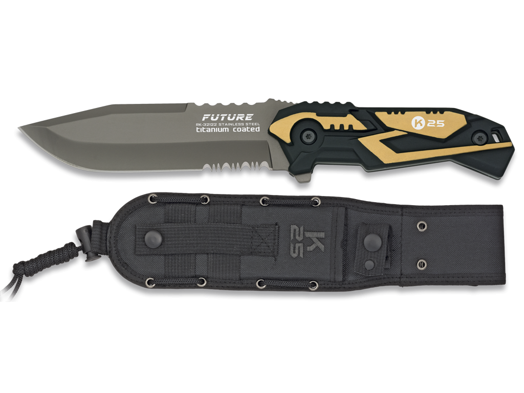 A RUI Tactical K25 32122 Future kés integrált acélszerkezettel, titán bevonatú, részben fogazott pengével és csúszásmentes alumínium markolattal tökéletes választás taktikai és outdoor használatra.