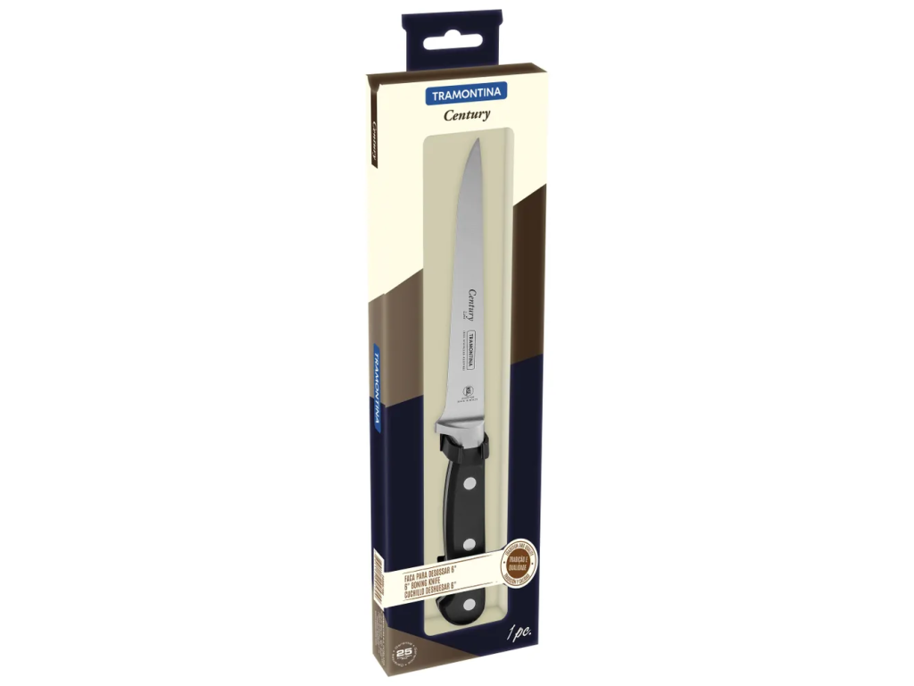 A Tramontina Century csontozókés (15 cm) olyan professzionális konyhakés, amelyet a pontos, biztonságos és gyors csontozásra terveztek. A prémium rozsdamentes acél penge tartós élt biztosít, miközben a stabil, ergonomikus markolat kényelmes fogást ad – így a munka kontrolláltabb, a vágás tisztább, a kéz pedig kevésbé fárad.